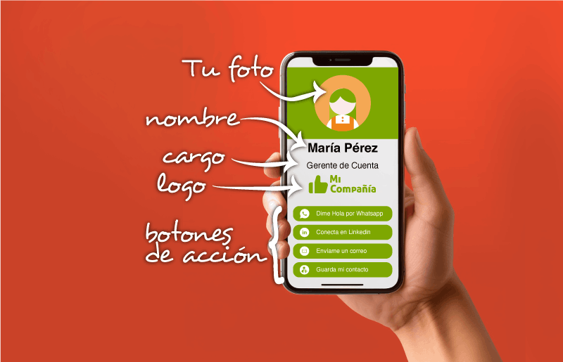 Con QR o tarjeta, o incluso compartiendo tu link personal, ingresas automáticamente a tu perfil en línea, con toda tu información de contacto, con los colores de tu marca, tu foto y los detalles que quieras para que te contacten como más te guste.